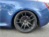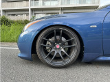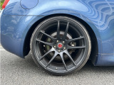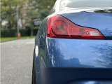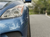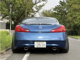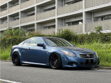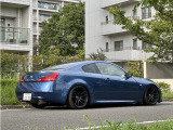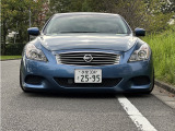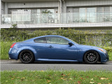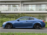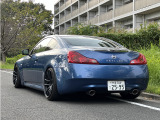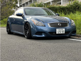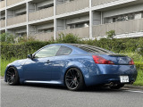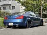 日産 スカイラインクーペ平成20年式です。鮮やかなブルーのクーペは、WORKの20インチ艶消し黒ホイールと車高調でスポーティな印象を