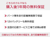 店舗取扱い保証付き(納車後 12ヶ月以内 走行距離無制限) 1年間走行無制限保証。バッテリーも保証対象。全国3000ヵ所の日産サービス工場で保証整備が可能です。有料で最長3年間のワイド保証プレミアムもございます。(詳しくは当店スタッフまでお尋ね下さい。) |